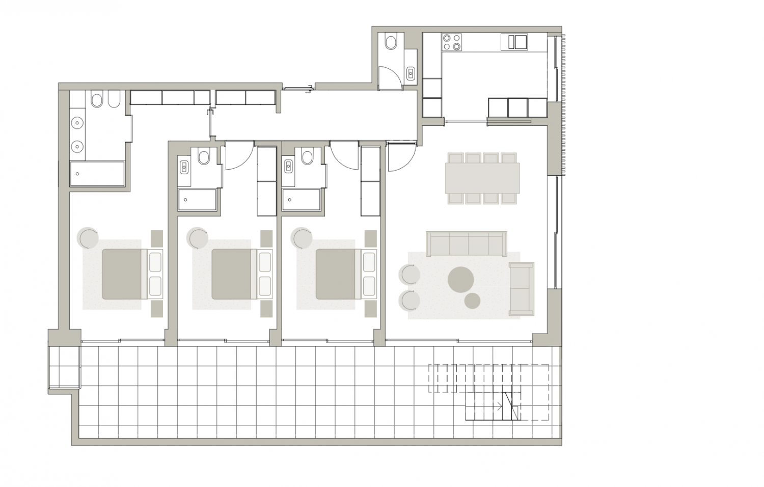 Exclusivo Apartamento T3 com Terraço Privativo de Grandes Dimensões – Sofisticação e Conforto Descubra este extraordinário apartamento T3, onde o design contemporâneo se alia a áreas generosas e a uma vivência exterior verdadeiramente única. Com uma área interior de 130,7 m², este imóvel destaca-se pela sua organização fluida e elegante. A zona social apresenta uma ampla sala de estar e jantar em conceito open space, integrada com uma cozinha moderna, criando um ambiente sofisticado, luminoso e ideal para receber. A área privada oferece três quartos espaçosos, incluindo uma requintada suíte, pensados para garantir conforto e privacidade absoluta. O verdadeiro destaque deste imóvel reside nas suas excecionais áreas exteriores: uma elegante varanda com 42,3 m² e um magnífico terraço privativo com 115,6 m², perfeito para momentos exclusivos de lazer, refeições ao ar livre ou simplesmente desfrutar de um ambiente tranquilo com total privacidade. Para maior comodidade, o apartamento inclui 2 lugares de estacionamento (64,6 m²). Área total aproximada: 353,2 m² ✨ Destaques: •Arquitetura contemporânea e linhas elegantes •Amplas áreas interiores e exteriores •Terraço privativo de dimensões raras •Excelente exposição solar e luminosidade •Zona social ampla e sofisticada •Estacionamento para duas viaturas Uma propriedade distinta, pensada para quem valoriza espaço, conforto e uma experiência de habitação superior.